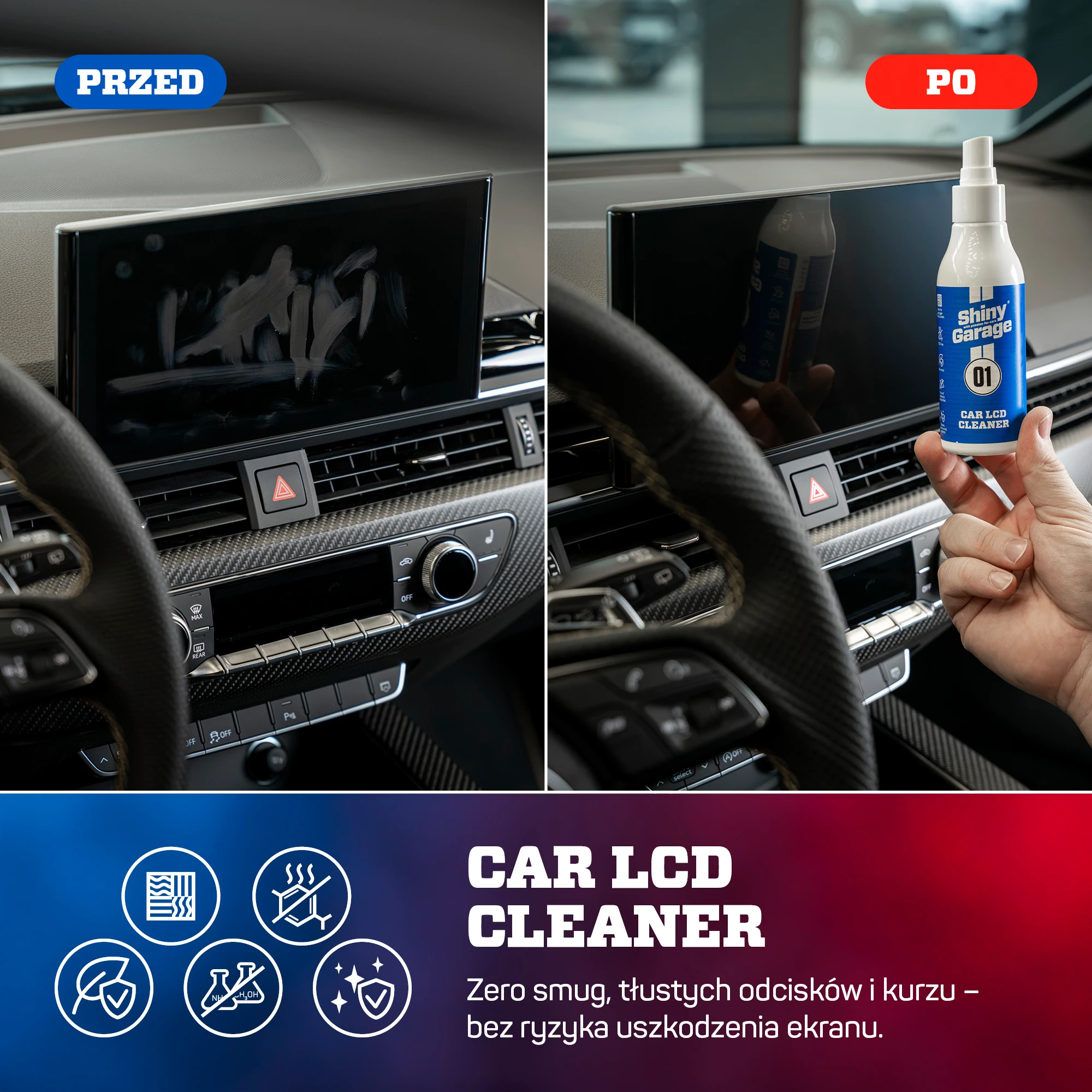 Shiny Garage Car LCD Cleaner to sprawdzone rozwiązanie dla kierowców, którzy szukają skutecznego, bezpiecznego i łatwego w użyciu preparatu do czyszczenia ekranów dotykowych w samochodzie. Postaw na jakość polskiej marki i zadbaj o każdy detal wnętrza auta.